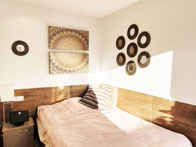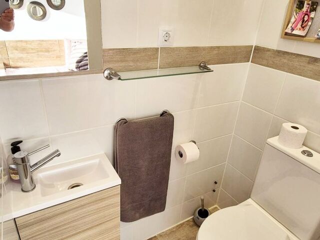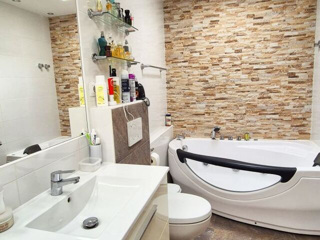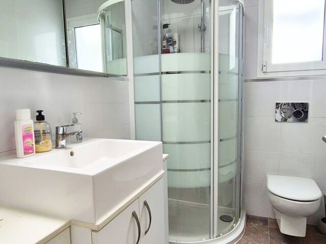 Eines der Badezimmer ist mit Dusche ausgestattet, das zweite - ensuite zum Masterbedroom - bietet außerdem eine Badewanne, die über eine Jacuzzi-Funktion verfügt. Im großen Schlafzimmer stellt ein Einbauschrank ausreichend Stauraum sicher. Die verwendeten Farben und Materialien übermitteln ein beruhigendes, friedvolles Ambiente.