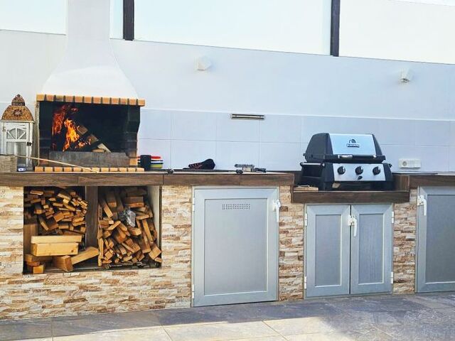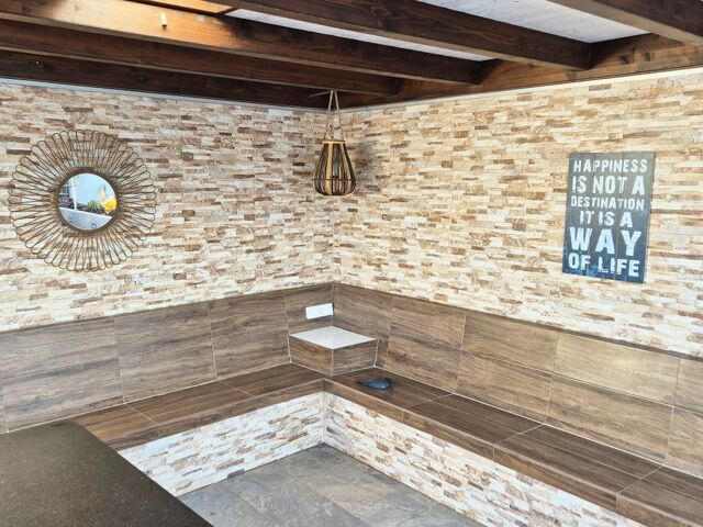 Im Außenbereich erwartet Sie ein überdachter Freisitz für Abende in gemütlicher Runde. Ausreichend Platz für Sonnenliegen und weitere Bestuhlung gibt es außerdem. Leicht zu pflegende Pflanzbeete und die Außenküche mit Grill bieten zusätzlichen Komfort.
